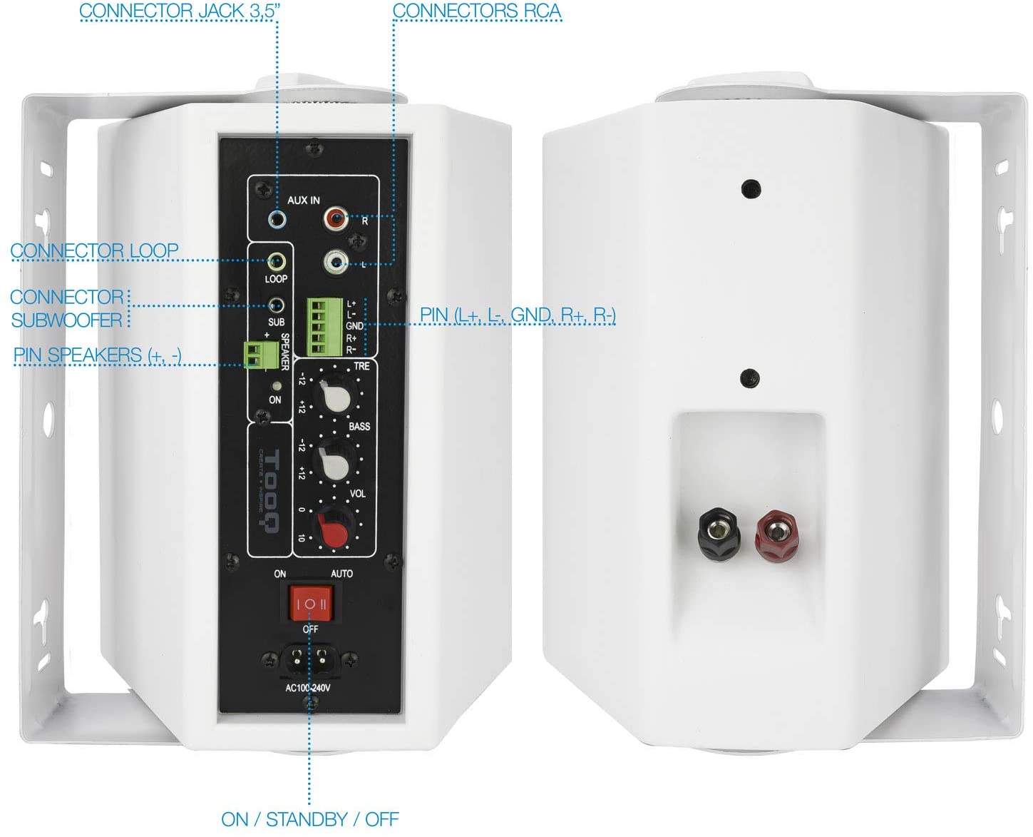 – Salidas: 1 x conector 2 terminales (salida de altavoces); 1 x conector Jack 3.5mm (salida de subwoofer); 1 x conector Jack 3.5mm (salida para añadir altavoces activos).