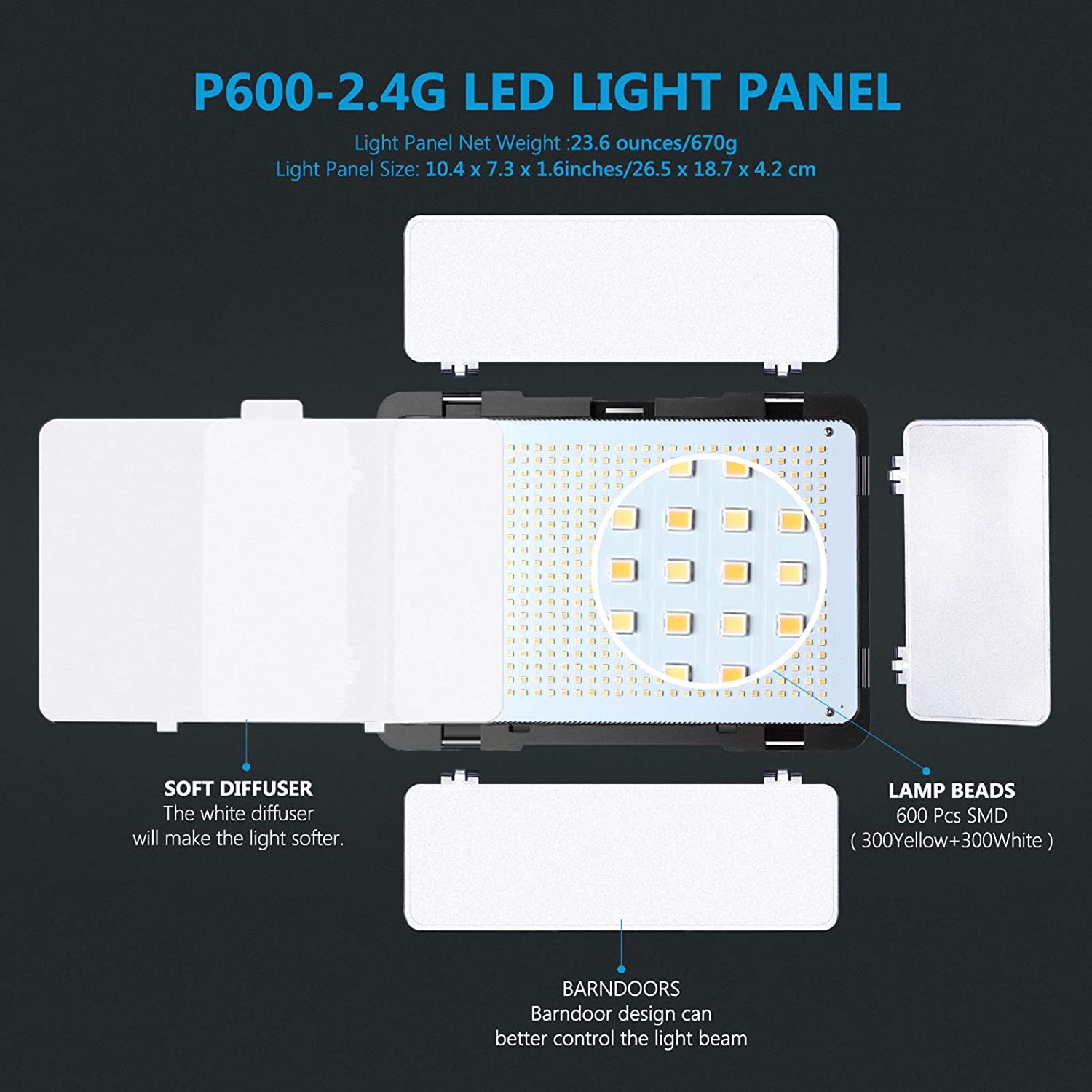 Modelo: P600-2,4G; Cantidad de LED: 600 piezas (300 amarillo + 300 blanco); Temperatura de color: 3200-5600K (± 100); CRI: 95+