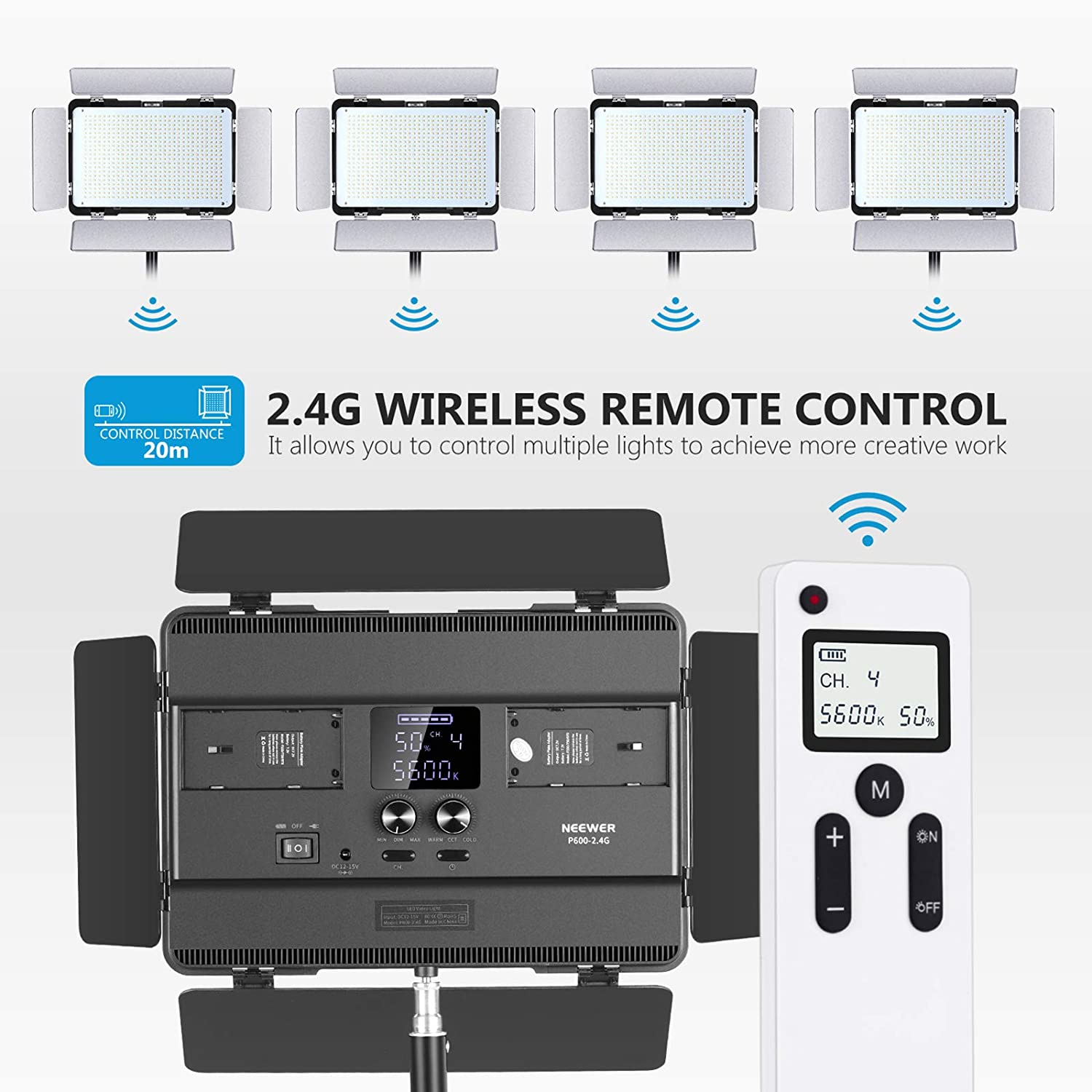 - El diseño actualizado con pantalla LCD clara puede mostrar el brillo, la temperatura del color, los canales y el estado de la luz.