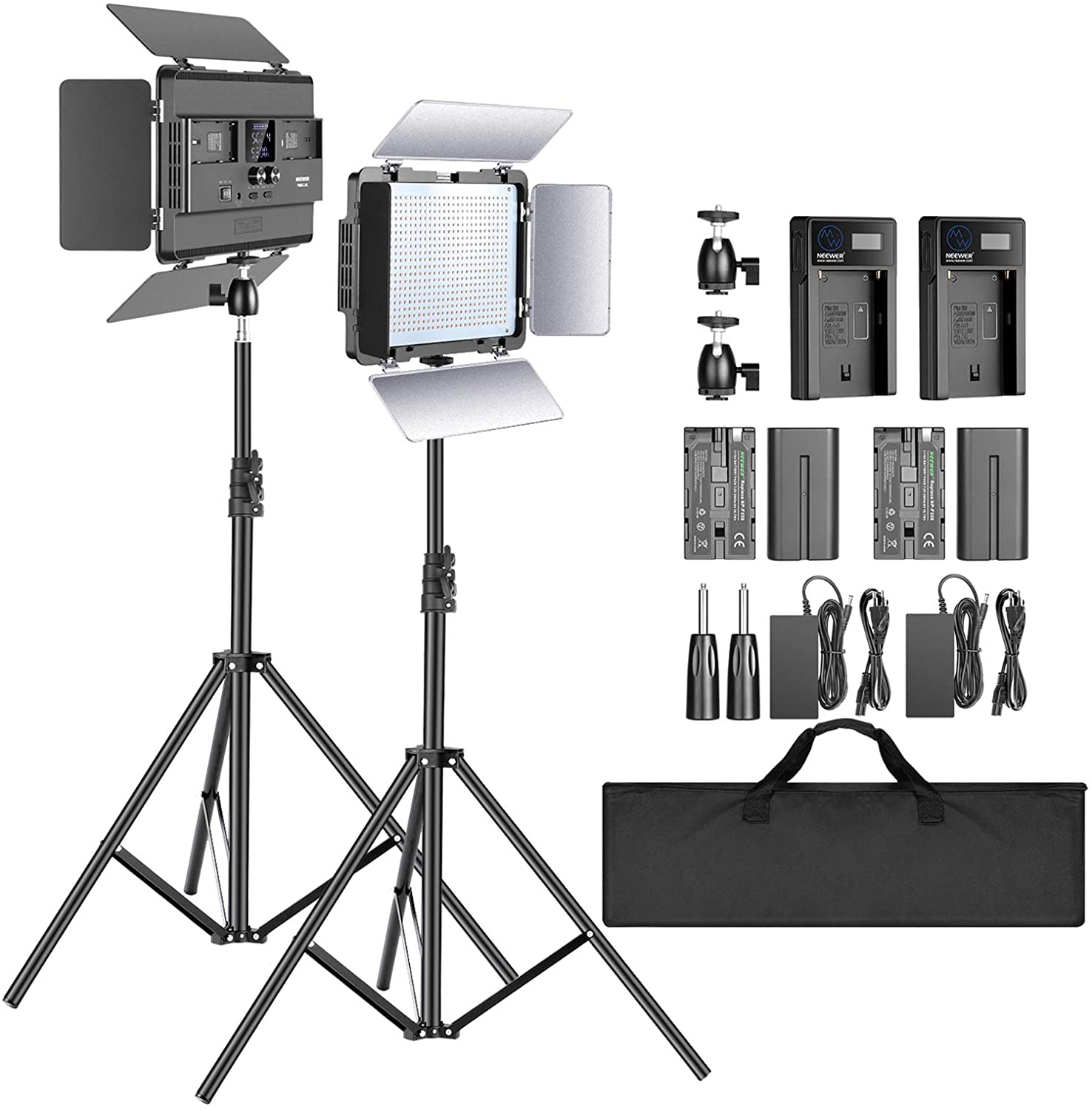 Neewer 2-Paquete Luz LED 2,4G con 600 Cuentas LED/Soporte 2M/Barndoor/Pantalla LCD/Rótula/Control Remoto/Batería/Cargador/Estuche Incluido